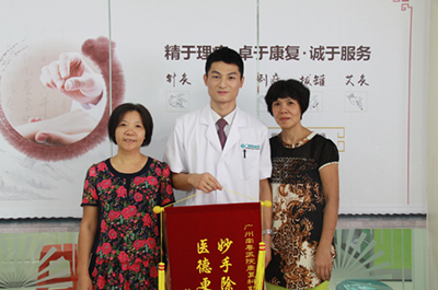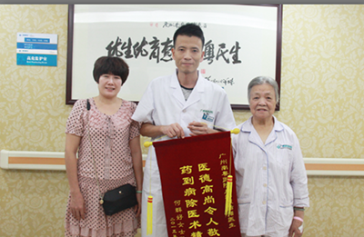来自番禺市桥的林阿姨,长期腰痛,有时疼痛得走不动路。来到广州南粤医院中医理疗室,经郭鸿来医师采用针灸和推拿手法治疗后,康复很快,林阿姨连连称奇:“做了这个中医理疗,腰马上就不疼了,人好像变年轻了一样。”郭医师告诉她病情并未完全治愈,日常生活中要进行预防。林阿姨非常感激,特地和家人送来锦旗,以表谢意。