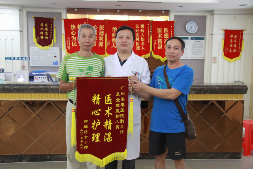 一周后,由于何婆婆根据戢运军医师制定的方案进行治疗,效果明显,并且戢医师每日都进行电话问询和指导。广州南粤医院医护人员的专业和认真,让何婆婆倍感温暖。因此一周后,她委托家人再次送来锦旗,特别感谢住院部及戢运军医师。