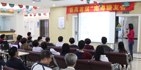 原番禺区何贤医院内科副医师、番禺本地知名内科医师曾维俭医师,在糖友会上给糖友们介绍了糖尿病的基本知识、糖尿病的紧急预防措施、糖尿病的饮食、运动、药物治疗方法。曾维俭医师介绍,糖尿病并不可怕,可怕的是它一系列的并发症,如失明、肾衰竭、糖尿病足、心脏病、中风等,他叮嘱糖友们一定要养成良好的生活习惯,控制血糖。并总结出了简单易记的控糖顺口溜:“管住嘴,多饮水,勤跑腿”。曾维俭医师通过专业的讲述把糖尿病的知识传达给了到场的糖友们,他通俗易懂的语言、典型案例的分析,受到糖友们的热烈欢迎。