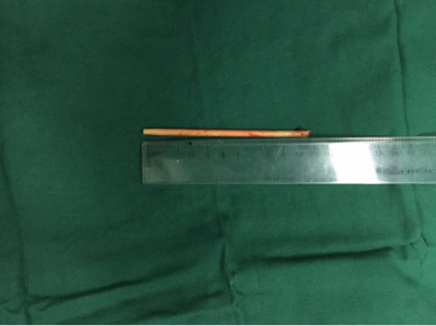 一根筷子硬生生刺进了女性下体,23岁女子以为自己就能徒手把筷子拔出来。谁知道筷子非但拔不出来,她还感到下体剧痛、排尿困难,且伴有阴道出血。就医时情况,筷子已经从阴道与尿道间隙刺进了膀胱,扎得很深,损伤了周围的组织,若是再晚一点才就医,就会带来生命危险。万幸,经过1个小时的手术,医师最终将这截将近11厘米的“凶器”成功取了出来(如下图)。这惊险一幕,日前就发生在广州南粤医院。