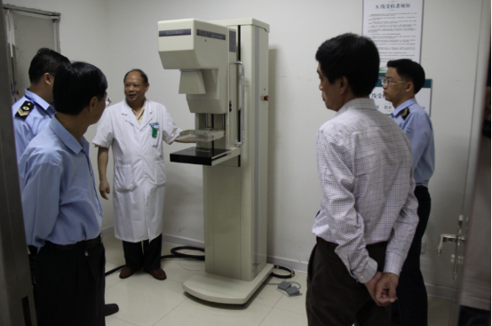 卫监部门领导特别对放射科进行了检查,放射科医师正在介绍科室设备