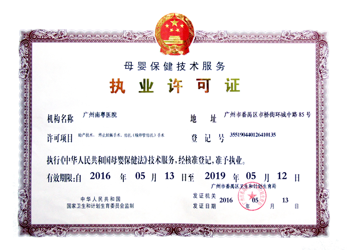 广州南粤医院作为国家卫生行政部门批准设立的现代化综合性医院,持有《医疗机构执业许可证》,在手术医师、方式、器械、手术室等一系列医疗技术上,符合同级卫生行政部门制定的医疗保健机构设置规划和《母婴保健专项技术服务基本条件》,因此获得卫生行政部门审批的《母婴保健技术服务执业许可证》,拥有进行助产、终止妊娠、结扎等手术的资质,并为女性安全提供保障。