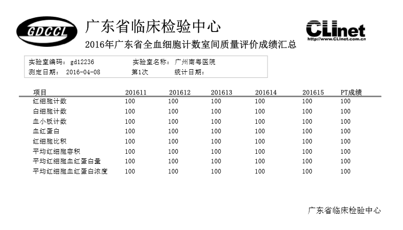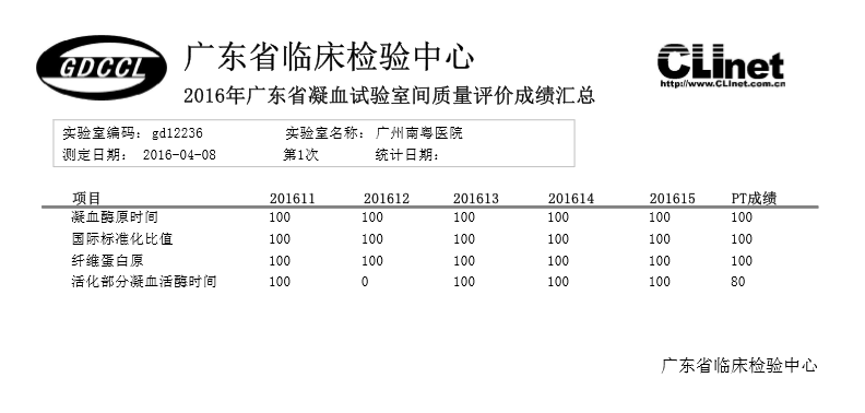 从上图室间质评结果显示可知,广州南粤医院检验科的红细胞计数、白细胞计数、血小板计数、红细胞比积、血红蛋白、平均红细胞容积、平均红细胞血红蛋白量、平均红细胞血红蛋白浓度、凝血酶原时间、国际标准化比值、纤维蛋白原等检验项目PT成绩为100分。